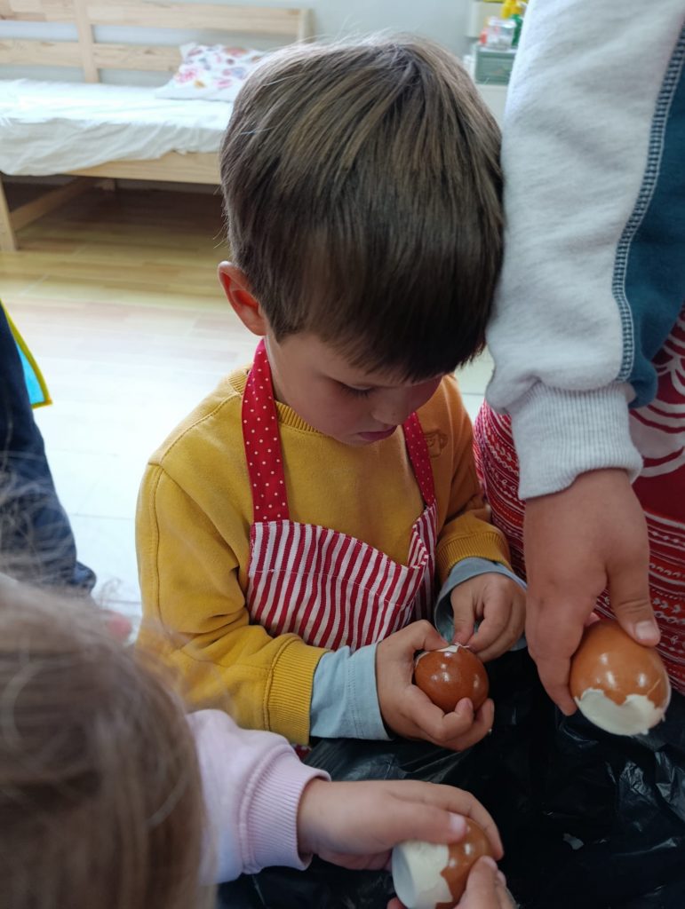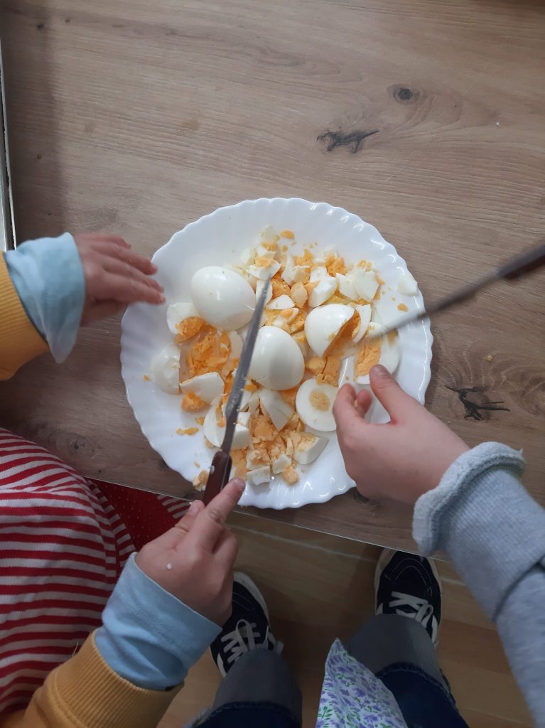 2.Quitamos la cáscara a los huevos y los picamos. Reservamos para más tarde.