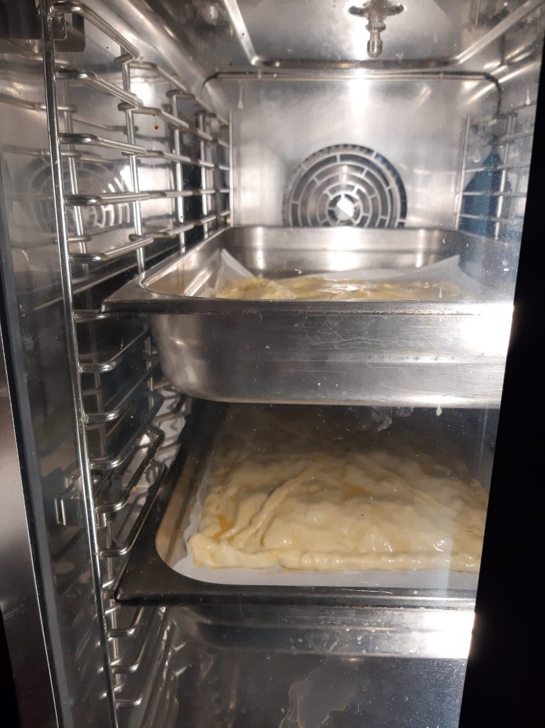 4.Extendemos una de las láminas de hojaldre sobre su papel de hornear en la bandeja de horno.