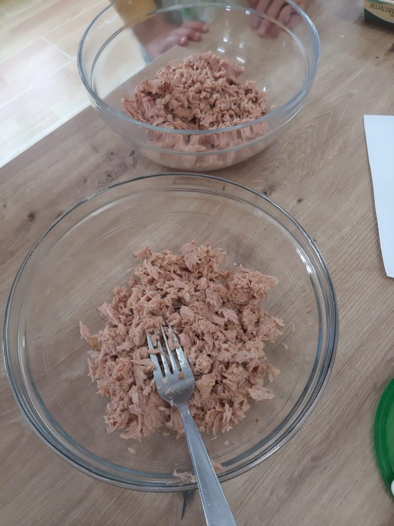 7.Añade el atún que ya habrás escurrido muy bien y desmenuzado. Repártelo por igual.