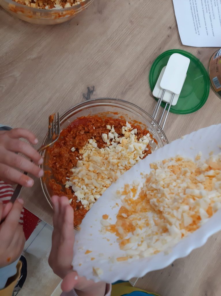 8.Añade los huevos cocidos troceados y repártelos por igual.