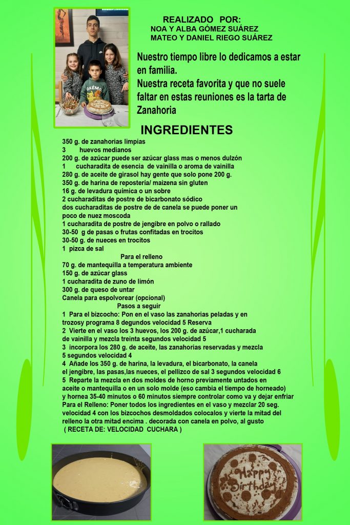 Nuestro tiempo libre lo dedicamos a estar en familia y en estas reuniones no suelen faltar nuestras recetas favoritas: Tarta de zanahoria y Gildas .