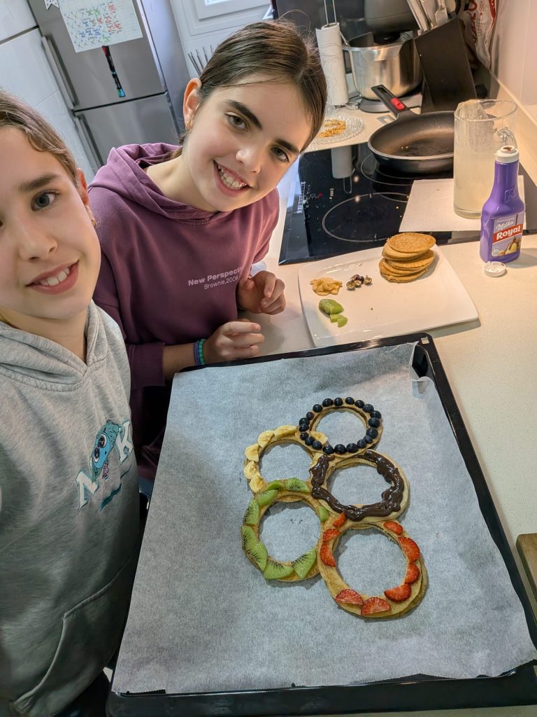 Nos encanta comer y nos encanta el deporte. En nuestro tiempo practicamos atletismo (Laia) y padel (Martina) . Y como tradición el día que competimos desayunamos tortitas, así que se nos ha ocurrido la idea de hacer los aros olímpicos de tortitas.
