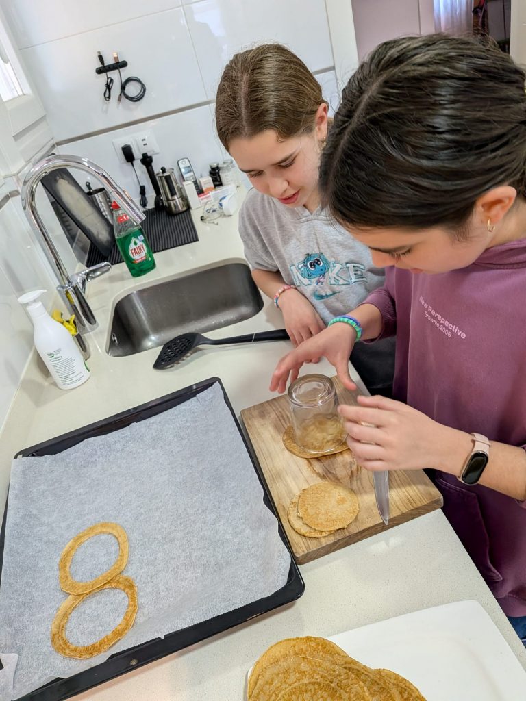 - Con un vaso hacer un agujero en el medio de las tortitas, después poner una encima de otra y en medio echar el chocolate.