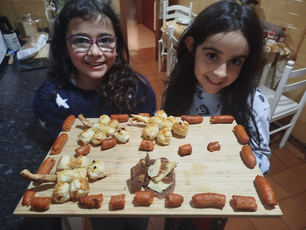 6. Para los ojos, cortaremos unos trocitos de aceitunas negras, y todo ello lo metemos al horno hasta que la masa de hojaldre esté hecha.
